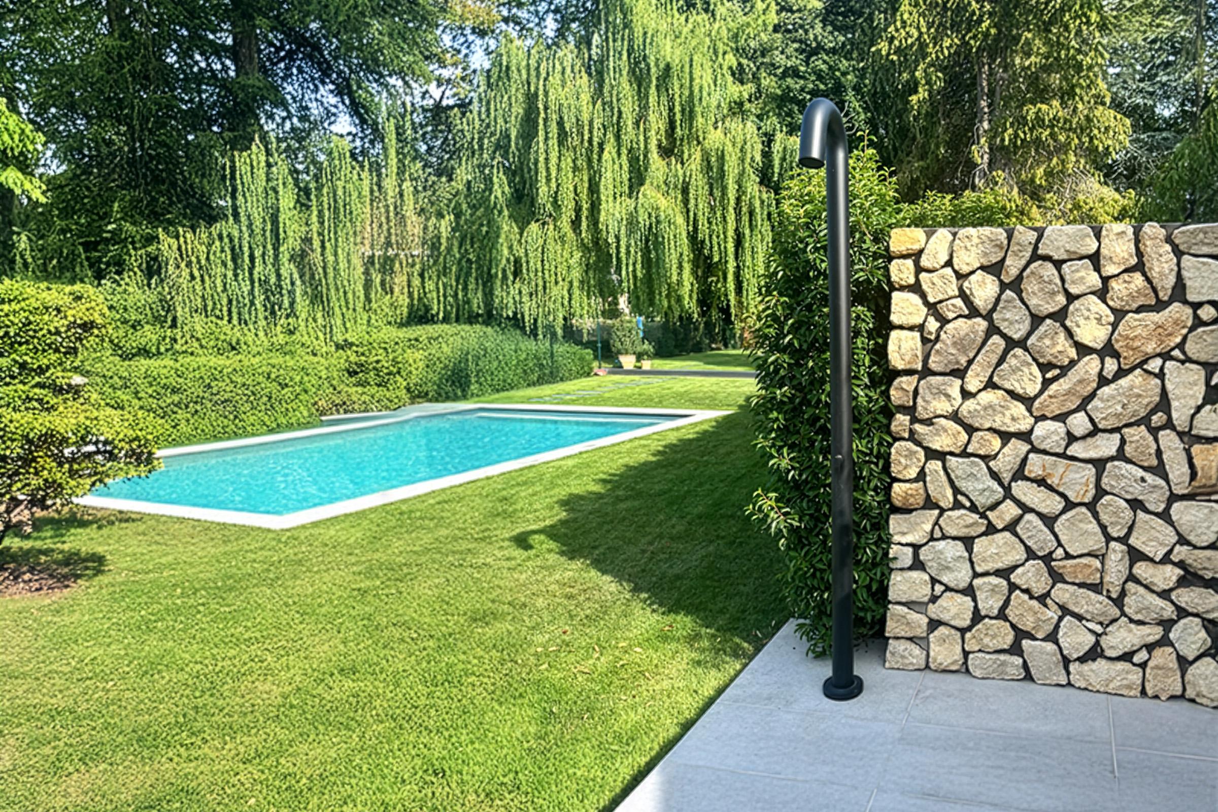 Deze Volutus buitendouche werd uitgevoerd met een mengkraan voor koud/warm water en door deze in RAL9005 te coaten, staat de buitendouche prachtig in deze weelderig groene tuin.